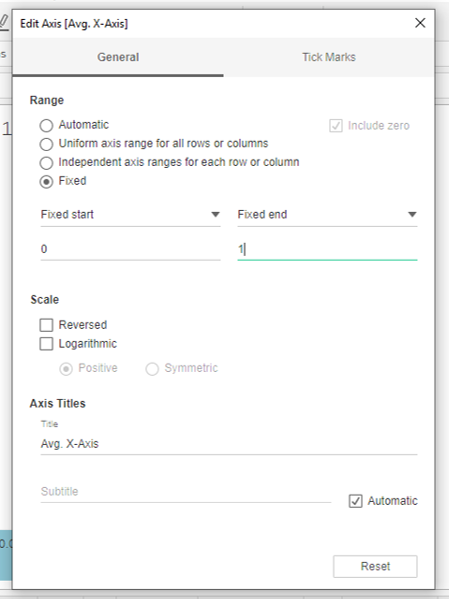 Then, right click on one of the axes, select the Edit Axis option, and then change the Range to Fixed. Make sure the start value is 0, and the end value is 1. Repeat for the other axis.