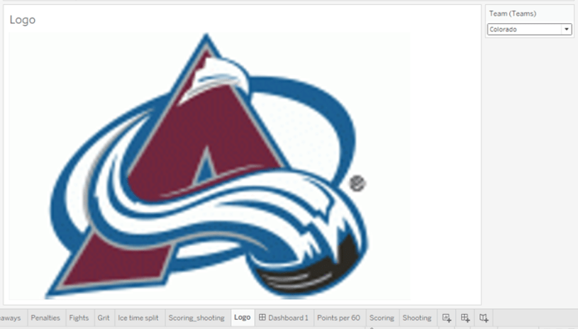 Today I want to take a look at one aspect of the dashboard that gave me a lot of trouble. The dashboard is filtered by team, and I really wanted to have the team logo appear and change as the fitler changed.